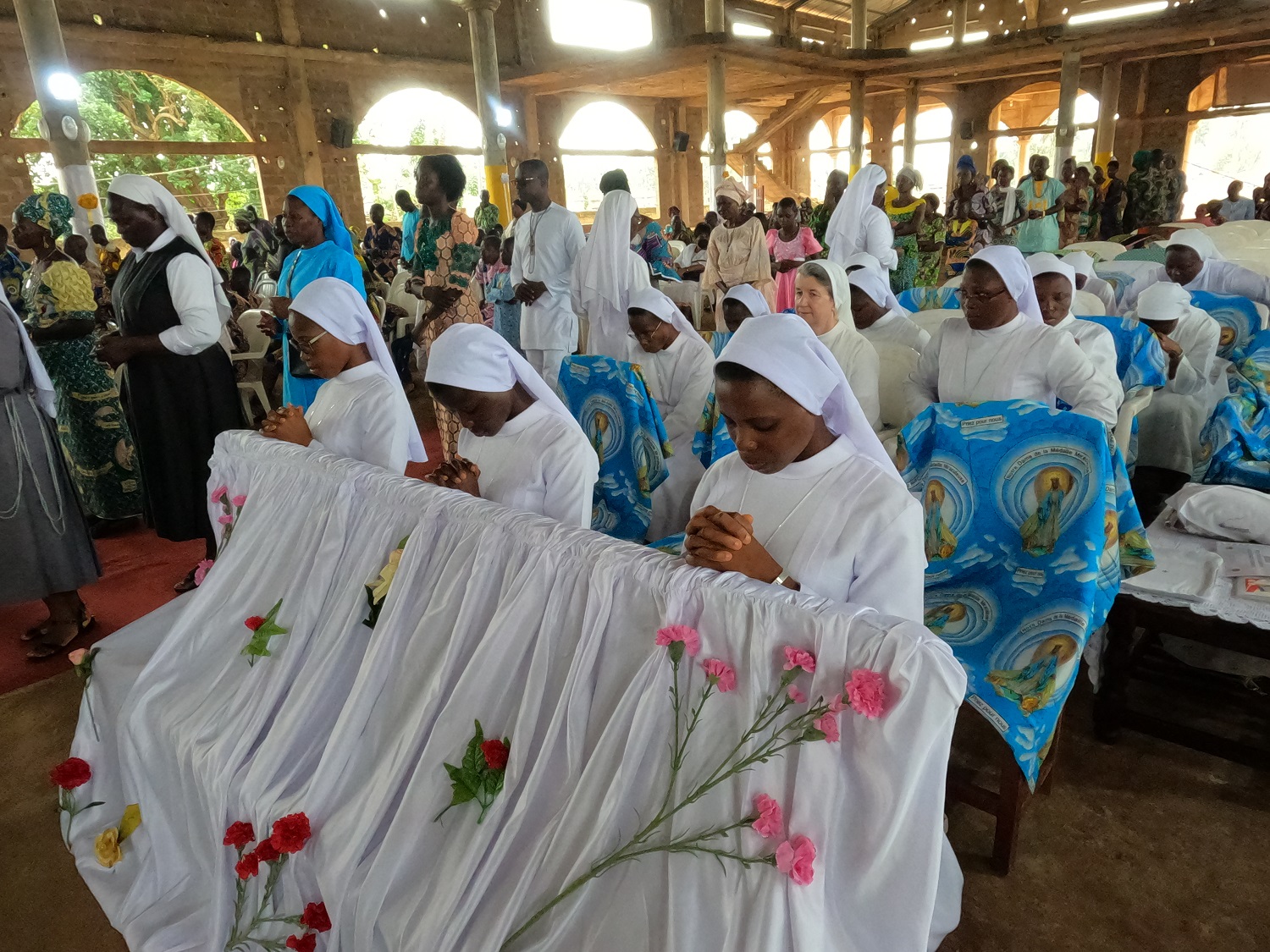Bischof Aristide Gonsallo wandte sich in seiner Predigt an die drei Nonnen und gab evangelische Ratschläge zu Armut, Keuschheit und Gehorsam, der Grundlage ihrer Gelübde. „Arm nach dem Vorbild Jesu, seid ihr berufen, die Armen zu retten. Durch eure reine Nächstenliebe werdet ihr im Licht des reinen Christus, der Quelle der Reinheit, leiden. Meine lieben Töchter, Gehorsam bedeutet, auf Gott zu hören, also hört auf ihn. Versteht, warum der Diener Gottes keinen Streit suchen wird“, erklärt er. „Das Geheimnis des Erfolgs in einem geweihten Leben ist die Jungfrau Maria, Unsere Liebe Frau auf dem Berge Karmel. Wenn ihr euch um sie kümmert, wird sie sich um euch kümmern. Bittet Maria, euch die Gnade zu erwirken, damit ihr euch ganz in die Hände Gottes gibt, möge sein Wille mit Freude und Dankbarkeit in euch geschehen“, fügte er hinzu. Der Prälat bedankte sich bei den Eltern für ihre Unterstützung und gratulierte der Provinzialmutter am Ende ihres Aufenthalts herzlich zu ihrer mütterlichen Anwesenheit.